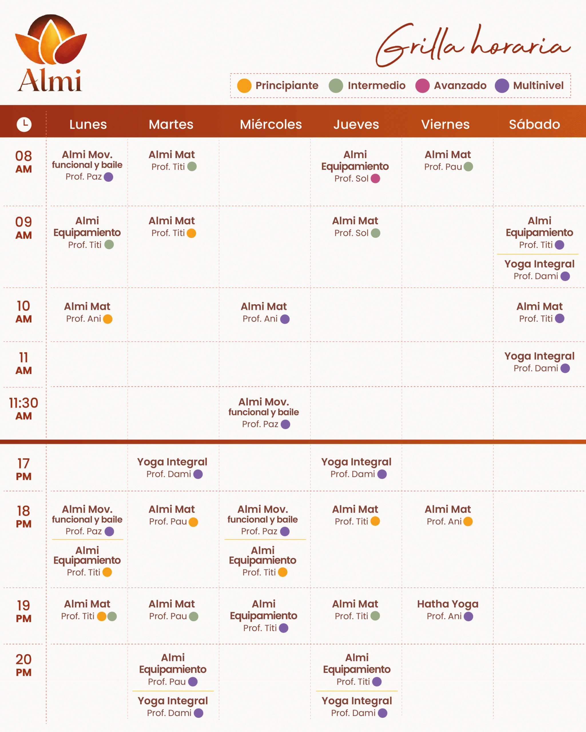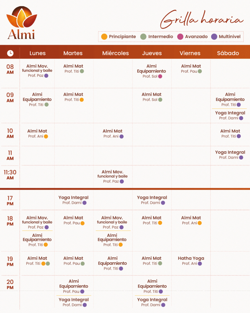Ana forma parte del equipo de Espacio ALMI como instructora de yoga y estudiante del Método ALMI. Su recorrido integra la práctica del movimiento con una búsqueda constante de conciencia y bienestar.